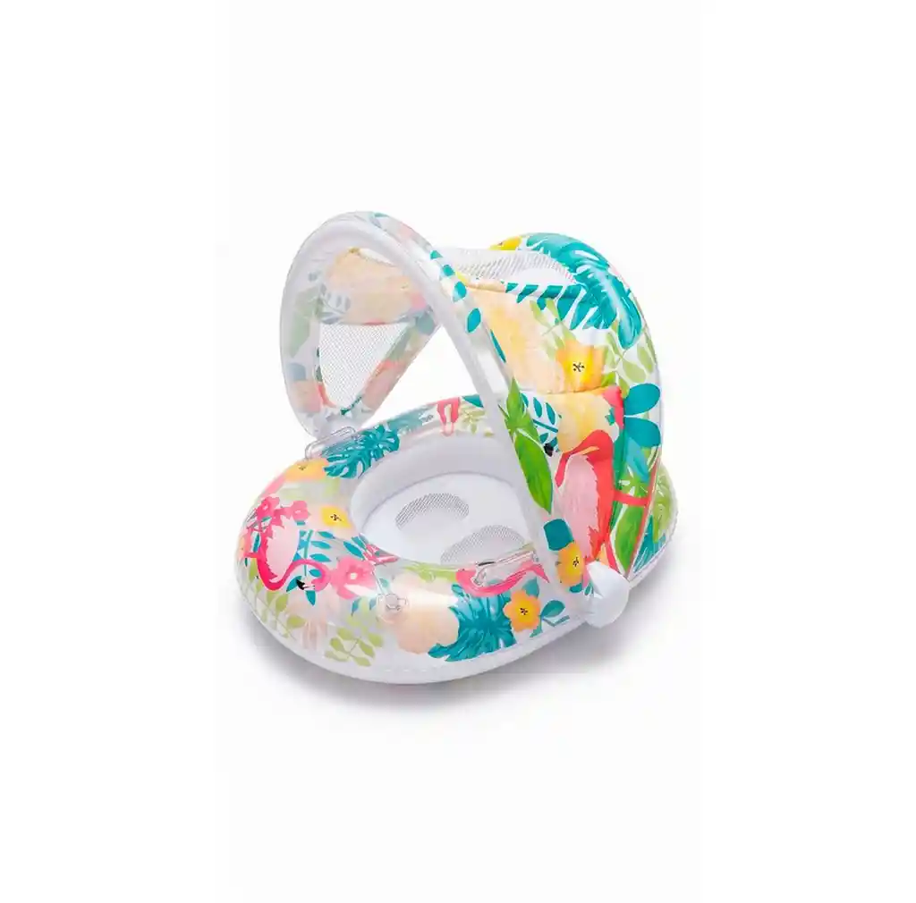 Este flotador inflable con un vibrante diseño de flamencos y flores tropicales es el accesorio definitivo para que tu bebé explore el agua con total seguridad y estilo. Diseñado pensando en la comodidad, cuenta con un asiento tipo pañal reforzado y una sombrilla integrada con ventanas de malla lateral que permiten la circulación del aire mientras protegen la delicada piel del pequeño de la radiación solar directa. Fabricado en PVC resistente y duradero, incluye dos asas de sujeción para que el bebé se sienta estable y seguro en todo momento, convirtiendo cada visita a la piscina o la playa en una experiencia de juego refrescante y protegida bajo la sombra. Ficha técnica Material: PVC de alta calidad y resistencia Edad recomendada: + 3 años Peso máximo soportado: 20 kg Dimensiones del producto inflado: 55 cm de largo x 60 cm de ancho x 70 cm de alto Válvulas de seguridad: Sí Uso recomendado: Piscinas y aguas tranquilas bajo supervisión constante de un adulto Políticas de garantía La garantía tiene una vigencia de 30 días calendario a partir de la entrega y cubre únicamente defectos de fabricación verificables, como fallas en las costuras de calor o válvulas defectuosas. Para aplicar a la garantía, el producto no debe presentar señales de uso en superficies ásperas, pinchazos causados por objetos externos ni daños por sobreinflado que comprometan la estructura del inflable. Se recomienda realizar una prueba de inflado en seco durante las primeras 24 horas tras recibir el producto para asegurar su hermeticidad antes de ser utilizado en el agua; cualquier daño derivado del mal manejo o falta de supervisión no será cubierto por esta política.