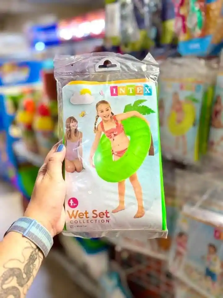 Flotador inflable de aro, como el que se ve en la imagen, para uso en piscinas, playas o mar.
