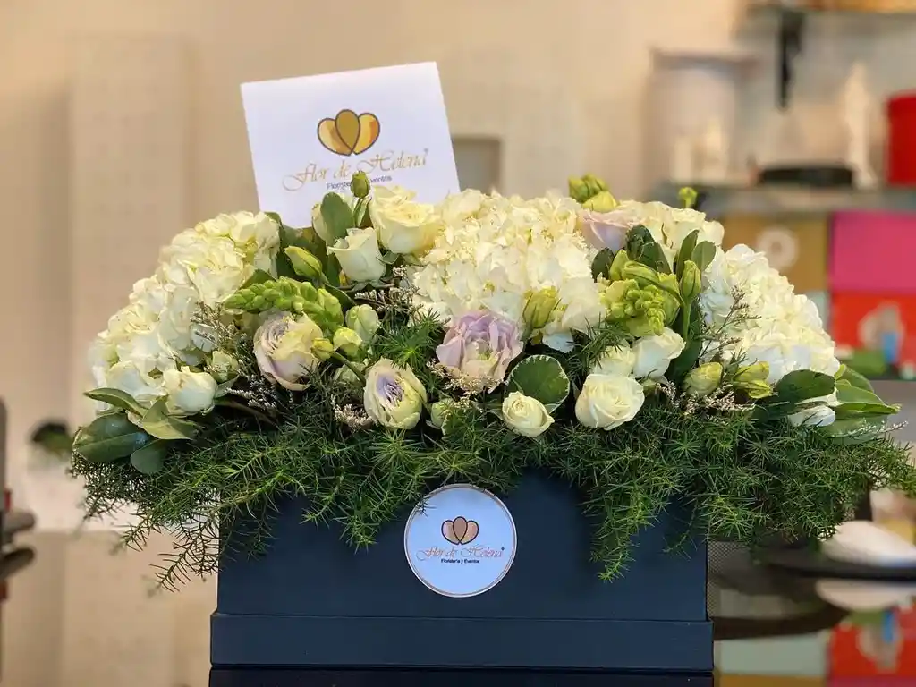 Hermoso diseño floral especial para condolencias elaborado en una caja rectangular para flores con rosas frescas, snack dragón, hortensias, caspia, pino, helecho cuero.