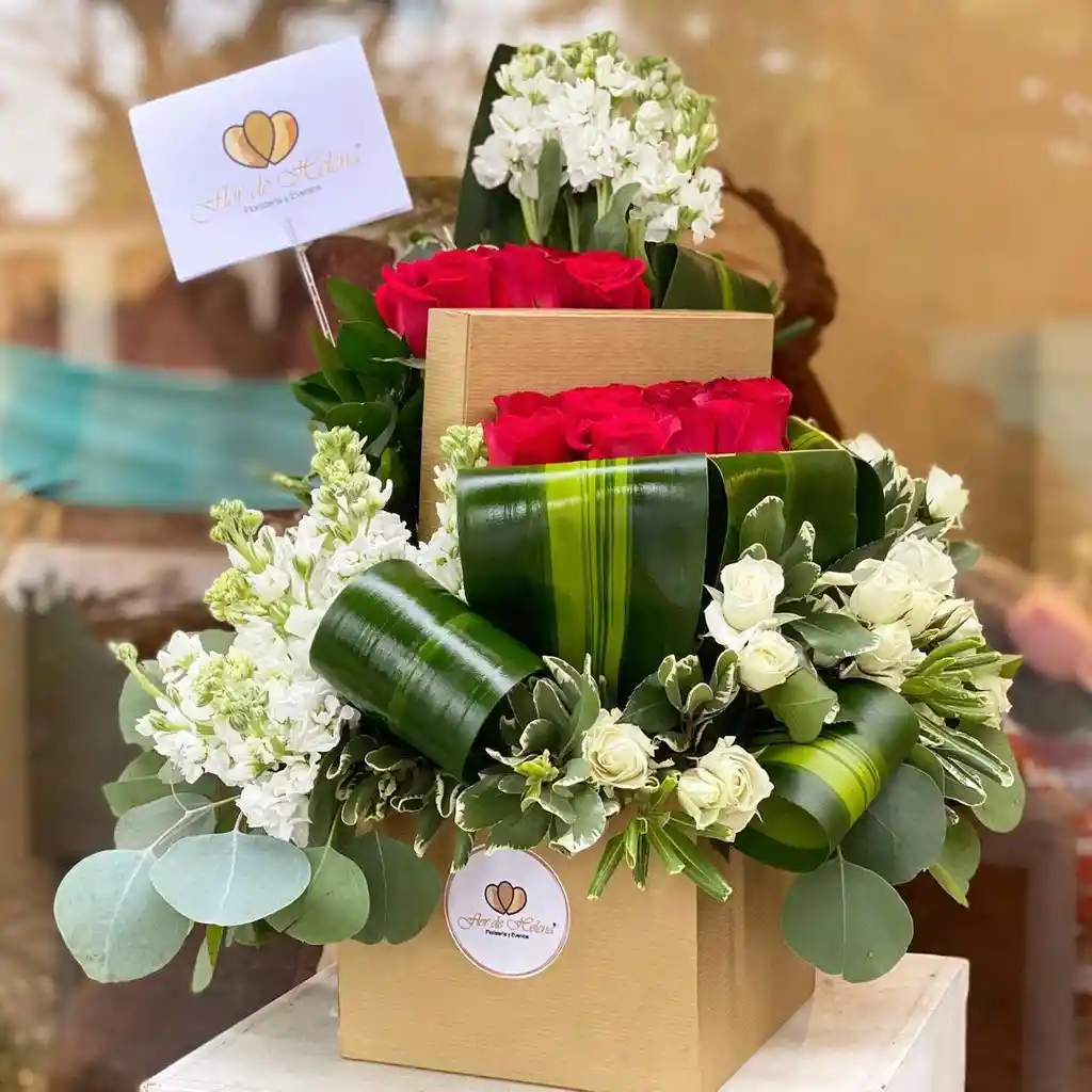 Hermoso diseño floral elaborado por Flor de Helena en una caja especial para flores con rosas frescas, hoja de dracena, lisiantus, eucalipto dólar, alelies.