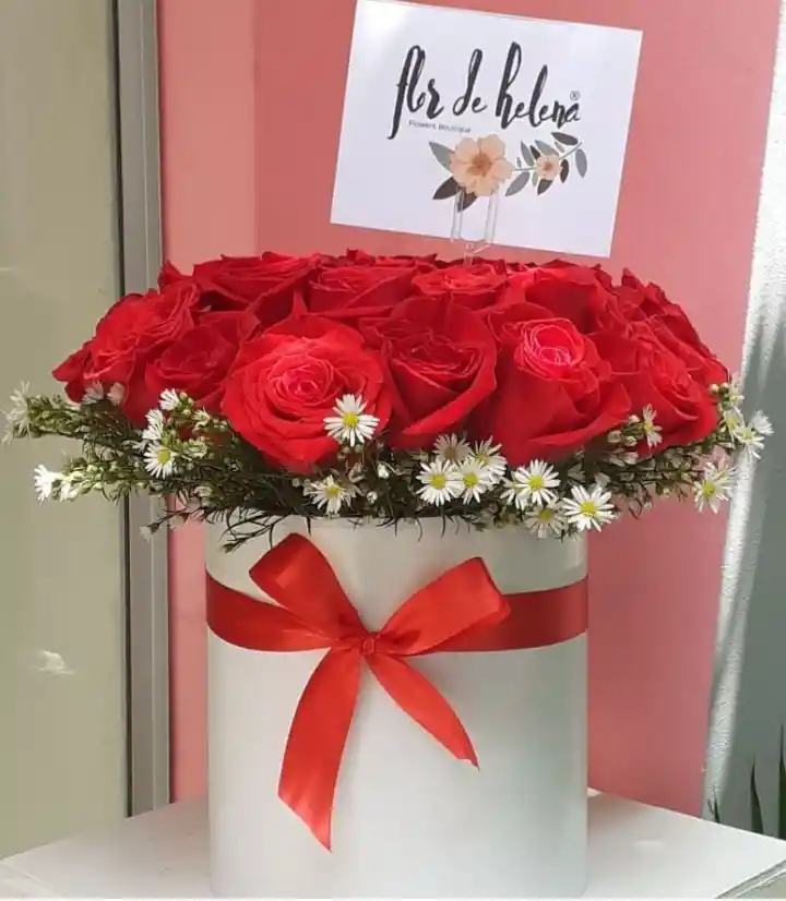 Hermoso diseño floral elaborado por Flor de Helena en una caja especial para flores con rosas frescas, aster y helecho cuero.