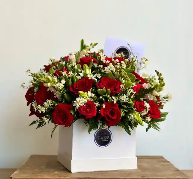 Exprese sus sentimientos con un hermoso diseño floral elaborado por Secret Stash en una box especial para flores con rosas frescas, helecho cuero, snack dragón, aster, estrella de Belén, fitusesporium.