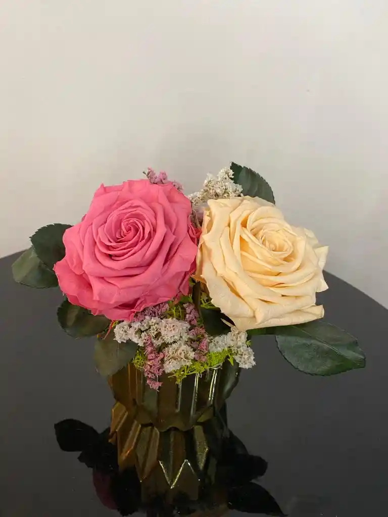 Arreglo floral preservado (Es Natural, se somete a un proceso para que perdure por más de 1 año, no son artificiales), contiene: 2 Rosas Premium (Tono durazno y palo de rosa) y follajes preservados, Base de color dorado. Es un arreglo floral pequeño pero encantador, iluminará sus espacios con la mejor energía y la magia del color. Incluye: -Tarjeta o carta con el mensaje que desee. -Caja Bukaflor. -Instrucciones de cuidado.