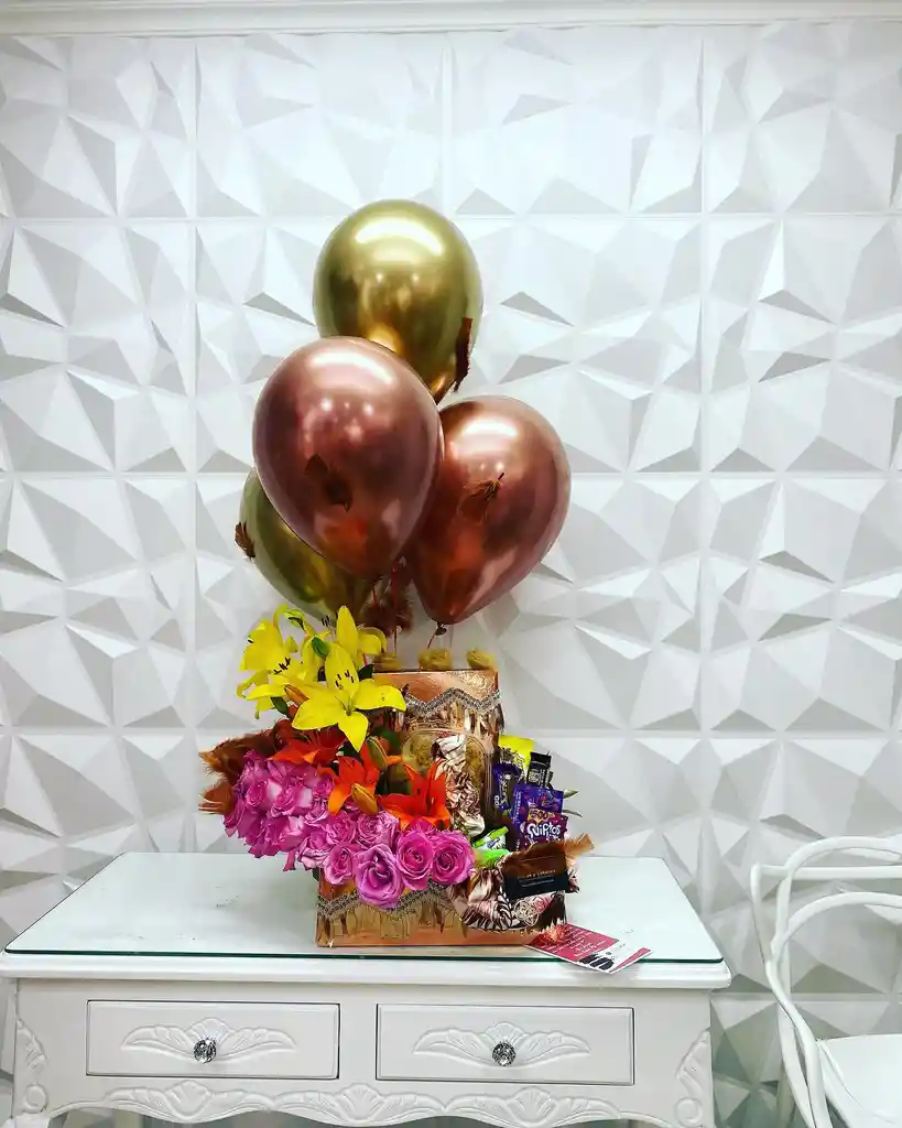 Arreglo floral en caja, globos, variedad de golosinas y decorativos elegantes según la imagen( tarjeta incluida)