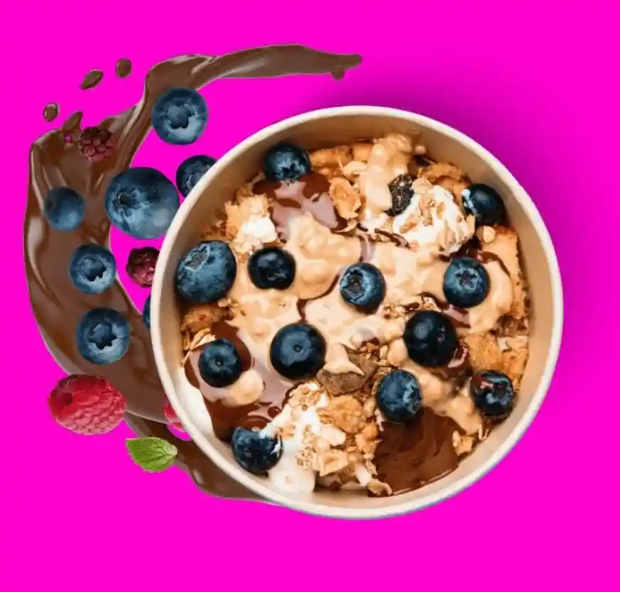 Masa Fluffy (postre austriaco), Yogurt Griego, Pistacho, Arándanos, Granola, Chocolate Amargo.