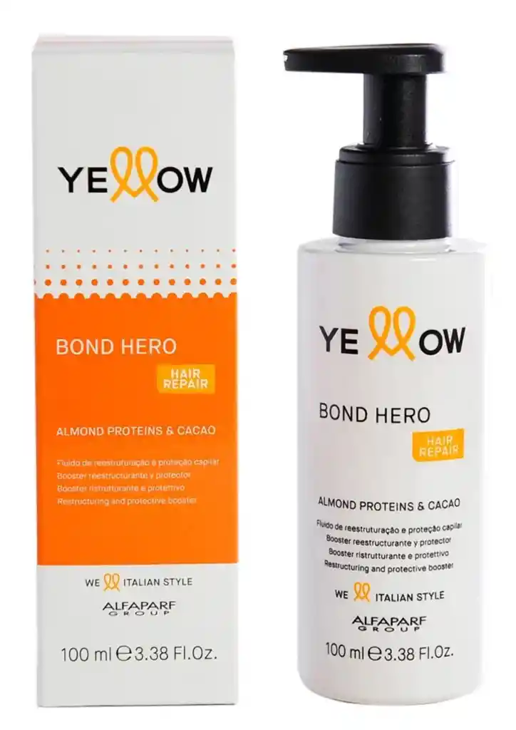 Yellow Bond Hero es un fluido concentrado de reestructuración profunda diseñado para proteger y reparar el cabello durante los servicios técnicos (coloración, decoloración o alisado) o como un tratamiento de choque intensivo en casa. Su tecnología avanzada actúa como un "escudo" que reconstruye los puentes de queratina dañados, devolviendo la integridad a la fibra capilar incluso en los cabellos más castigados y procesados. Beneficios Principales Protección Total: Protege la estructura del cabello durante los procesos químicos agresivos, evitando el quiebre. Reconstrucción Multi-Capa: Repara tanto la corteza interna como la cutícula externa del cabello. Versatilidad 3 en 1: Puede mezclarse con el tinte/decolorante, con otros tratamientos de la línea Yellow o usarse solo como suero reparador. Aumento de Resistencia: Deja el cabello visiblemente más fuerte, elástico y con una vitalidad renovada. Ingredientes Activos Su fórmula es una combinación equilibrada de ingredientes naturales y tecnología reconstructora: Proteínas de Almendra: Refuercen los enlaces internos de la fibra capilar, mejorando la resistencia y elasticidad. Manteca de Cacao: Proporciona una nutrición profunda y sella la superficie del cabello para un brillo intenso. Complejo Bond: Un activo específico que trabaja para "soldar" las cadenas de aminoácidos rotas por el estrés térmico o químico. Modo de Uso (Multifuncional) Este producto es extremadamente flexible según la necesidad: En Procesos Técnicos: Mezclar con el tinte o el polvo decolorante (en proporción recomendada por la marca) para proteger la fibra durante el proceso de color. Como Booster de Reparación: Mezclar 5 ml de Bond Hero con 20 g de cualquier mascarilla Yellow (Repair, Star, Curls, etc.) para potenciar su efecto tratante. Como Tratamiento Directo: Aplicar unas gotas sobre el cabello limpio y húmedo antes del peinado en zonas muy dañadas para una reparación continua. No enjuagar. Perfil Olfativo Presenta una fragancia elegante y profesional con notas cálidas de almendra y toques dulces de manteca de cacao, dejando un aroma de "tratamiento de salón" en el cabello. Especificaciones y Datos Técnicos Libre de Crueldad: Producto no testeado en animales (Cruelty Free). Cloruro de Sodio: Formulado sin sal, respetando la química natural del cabello. Libre de Gluten: Seguro para personas con sensibilidad al contacto con esta proteína. Presentación: Frasco de 100 ml con gotero o dosificador de precisión, diseñado para un uso medido y eficiente. Running Shopping, Somos especialistas en Belleza ; productos 100% Originales , garantizados y entregas rapidas !
