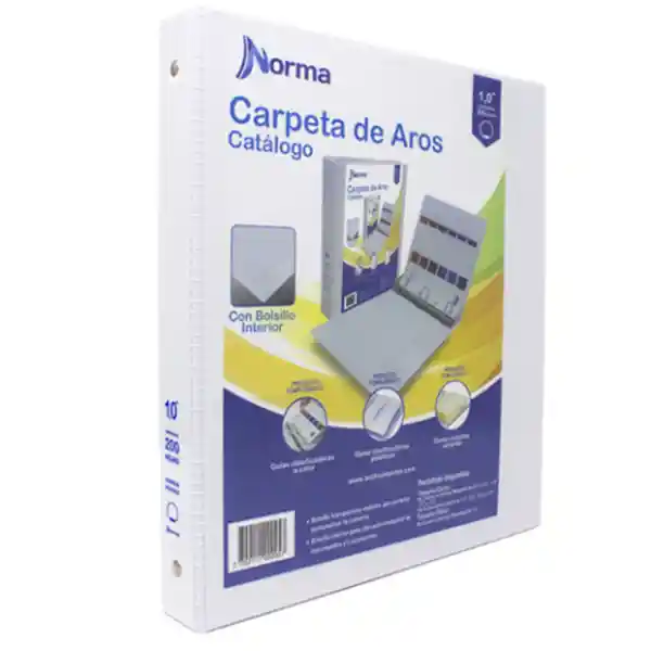 Folder Carpeta Tipo Catálogo 1,0 Pulgada 3 argollas Norma. Disponible con 3 aros. Herraje redondo y bolsillo interior para ubicación temporal de documentos y/o accesorios. Capacidad hojas: 200 – hojas tamaño carta de 75 gr.