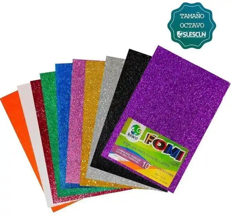 Fomi escarchado, paquete 10 unidades (21.5x28 cm, 50x70cm) Es un material de espuma sintética versátil, ampliamente utilizado en manualidades y diversas industrias. *Manualidades: proyectos escolares, elaboración de disfraces, mascaras, flores y tarjetas. *Industria del calzado: para fabricar suelas y plantillas de zapatos. *Deporte y seguridad: se usa en tapetes de gimnasio, áreas de juego infantiles y equipos de protección.