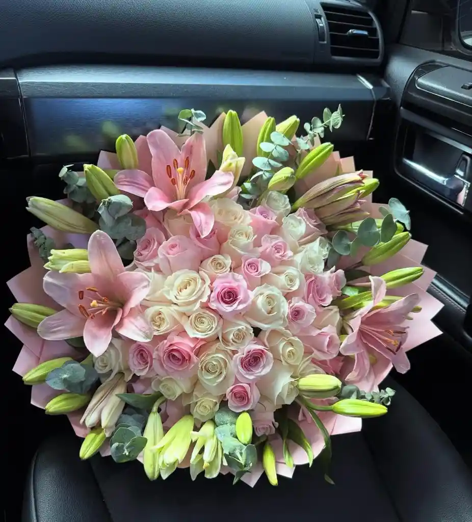en este encuentras 60 tallos de rosas 20 de lirio en un papel blanco con rosado