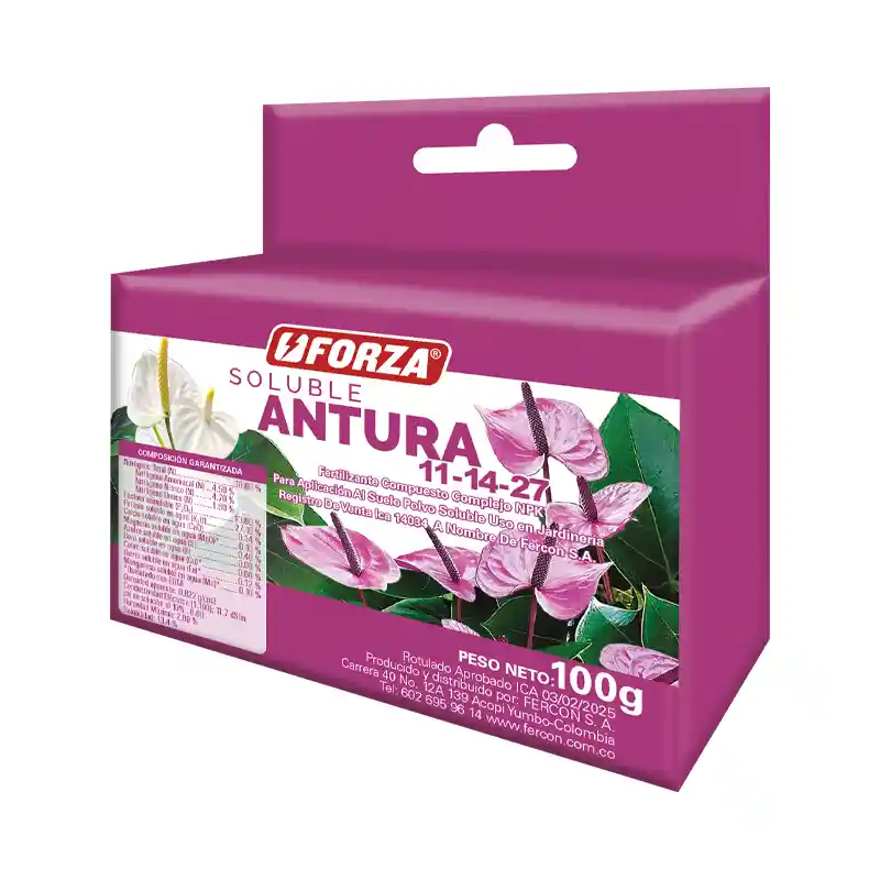 FORZA SOLUBLE ANTURA X 100G - Fertilizante especializado para anturios ANTURA es un fertilizante en cristales solubles que brinda una solución completa y eficaz al proporcionar los nutrientes adecuados en las proporciones ideales para estas hermosas plantas. Promueve un crecimiento saludable, vigoroso y una floración vibrante y duradera. Previene deficiencias nutricionales y aumenta la resistencia a las enfermedades. Su rápida disolución facilita su aplicación y asegura una absorción eficiente. Ideal para su uso en plantas cultivadas en macetas, jardines tropicales o en entornos comerciales. Recomendaciones GUÍA DE USO: Agite el envase antes de usar, disuelva de 1 cuchara (5 cc) en un galón de agua y riegue sobre el sustrato, puede repetir la operación cada 15 días.