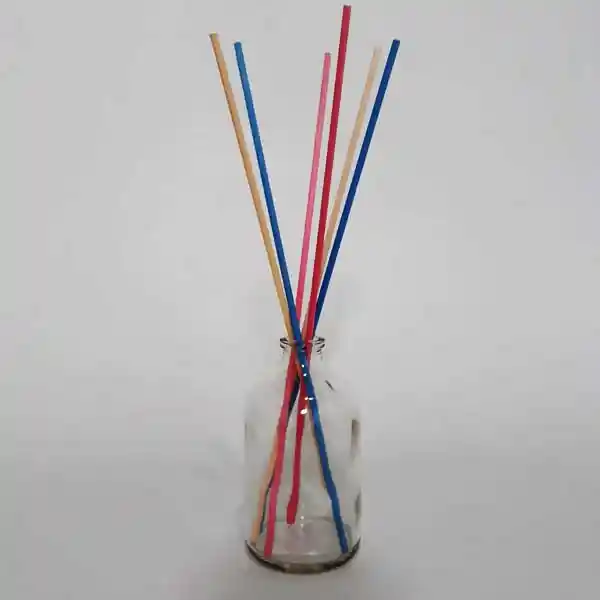 FRASCO DE VIDRIO BOCA N. 20 TRANSPARENTE CON CAPACIDAD DE 100 ML CON 6 VARAS DE RATAM DE COLORES PARA DIFUSOR DE AROMAS
