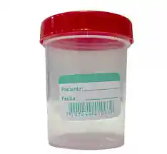 recipiente estéril, de plástico, con tapa de rosca hermética y boca ancha, diseñado para recolectar muestras de esputo para el diagnóstico de enfermedades como la tuberculosis