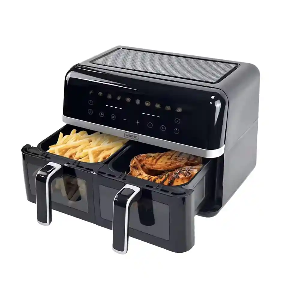 Freidora de Aire Mertec canasta doble MT-026 9 Litros La Freidora de Aire Mertec MT-026 con canasta doble y una capacidad de 9 litros es una opción versátil y eficiente para cocinar una variedad de alimentos de manera saludable. Este modelo cuenta con tecnología de circulación de aire caliente que permite freír, hornear, asar y deshidratar con un 80% menos de grasa en comparación con los métodos tradicionales. Sus dos canastas independientes permiten cocinar diferentes alimentos simultáneamente, ahorrando tiempo y energía. Además, incluye una pantalla digital táctil intuitiva con múltiples funciones preestablecidas para facilitar su uso. La superficie antiadherente de las canastas asegura una limpieza sencilla, y su diseño moderno y compacto se adapta perfectamente a cualquier cocina