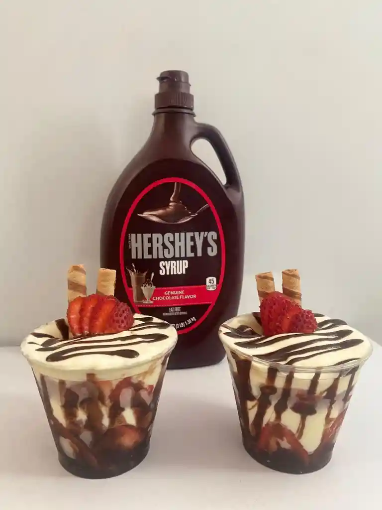 Fresas frescas , crema de leche, chocolate y hersheys