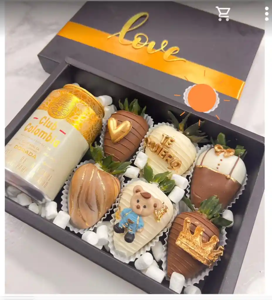 Fresas con chocolate, decoración exclusiva, caja de lujo por 6 fresas, lata de cerveza a gusto, (pedido mínimo con 24 horas de anticipación)