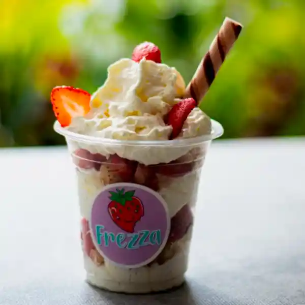 Fresas en trozos, acompañadas de crema chantilly y salsa de fresa.