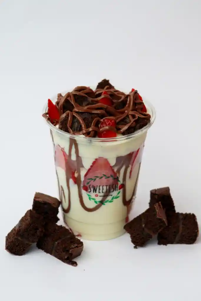 Fresas frescas, crema especial de la casa, salsa de chocolate y topping de Brownie.