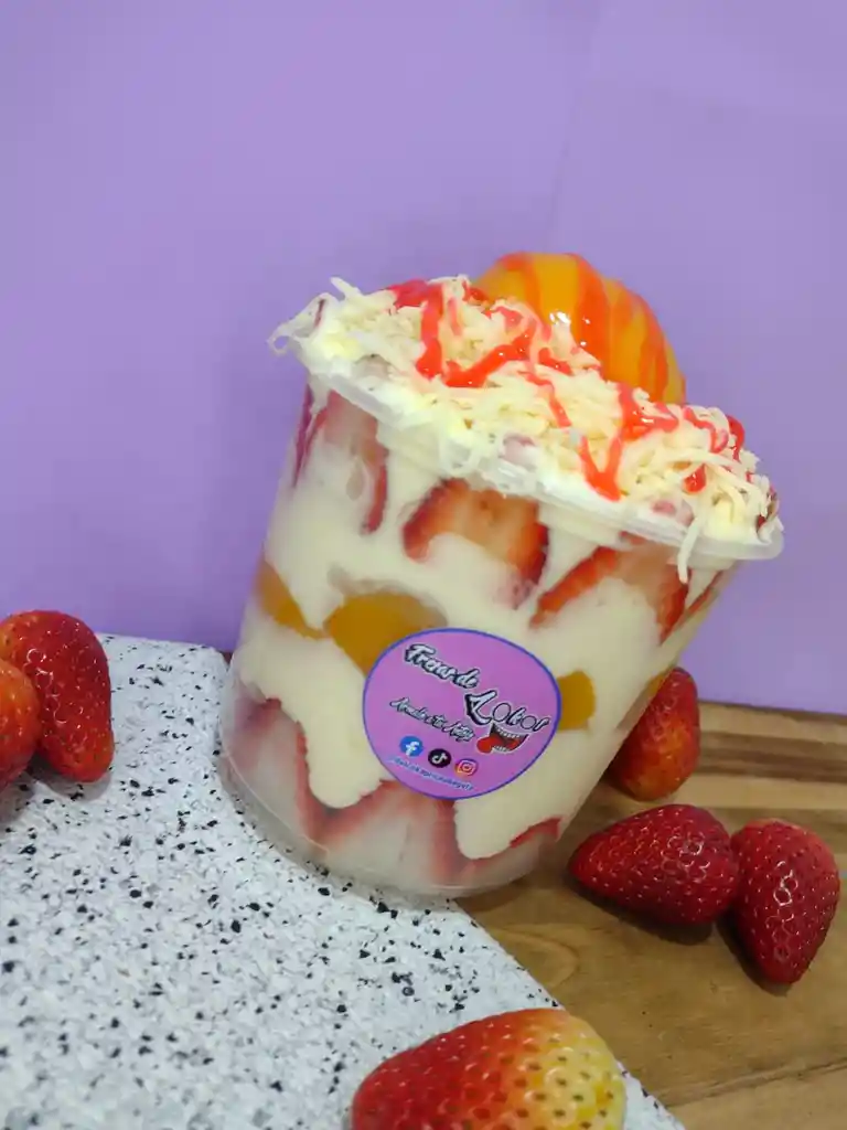 Deliciosas fresas con crema y durazno con base de nutella si lo deseas en vaso de 23 oz con bastante queso y la salsa que prefieras