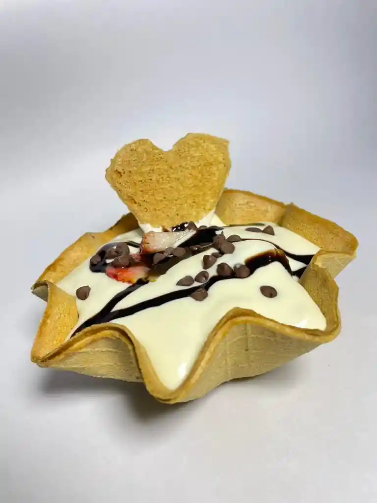 Deliciosas fresas con crema artesanal servidas en un cucurucho en forma de estrella con salsa y topping