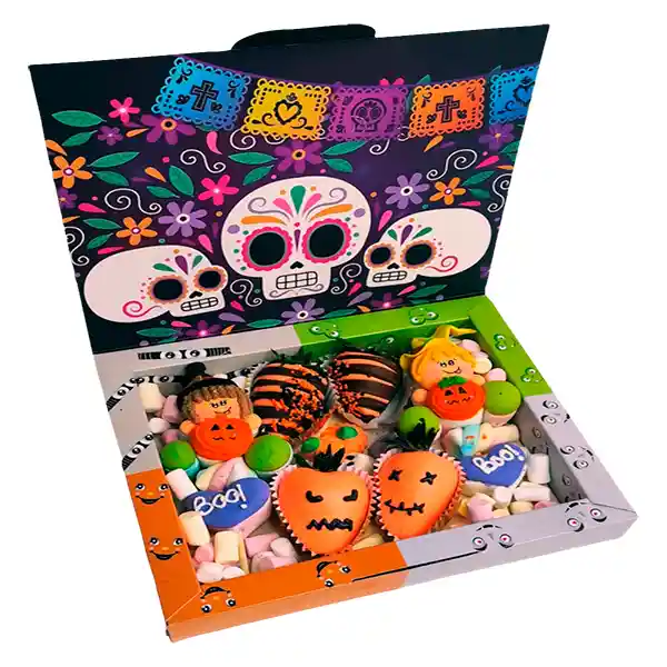 Esta monstruosa caja 🎃👻será el obsequio perfecto en esta fecha tan especial Para nuestros 👧👦. Contiene Masmelos 2 Und, + fresas chocolatadas 4 Und + mini suspiros + mínimas melos 4 Und + caja de cartón temático Helloween y tarjeta con mensaje. (diligenciar DE, PARA Y MENSAJE en los comentarios).