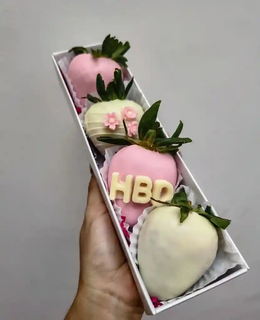 4 Fresas cubiertas con chocolate (tonos rosado y blanco ó marrón y blanco) Caja incluye moño y tarjeta