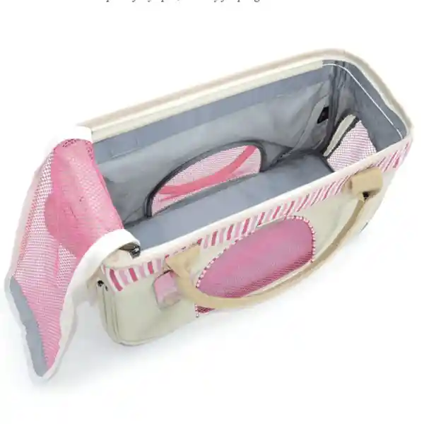 cargador con ventana superior con cremallera 3 ventanas laterales una de ellas con cremallera Tela impermeable. Disponible en color beige con rosado.Tamaño: 42 cms de ancho x 28 cms de alto x 19 cms de fondo.