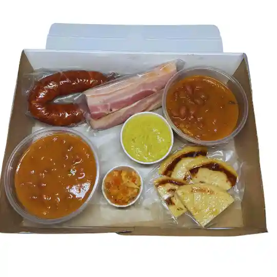 Cuatro porciones de frijoles acompañados de 250 gramos de chicharrón ahumado, 230 gramos de chorizo, una arepa porcionada, una porción de guacamole y una porción de hogao.
