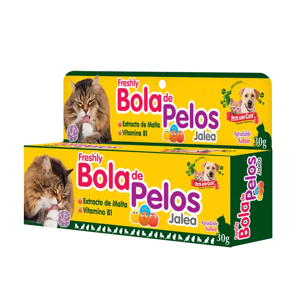 Freshly Bola de Pelos Jalea Jalea a base de extracto de malta y vitamina B1 que estimula la expulsión de la bola de pelo en los gatos, desprendiendo y deshaciendo el exceso de pelo acumulado en el tracto digestivo, haciendo un efecto laxante natural que no altera la flora intestinal, sin traumatismos, vómitos ni obstrucción. Agradable sabor con: • Extracto de Malta • Vitamina B1 Para gatos de todos los tamaños. Para todas las etapas de la vida.