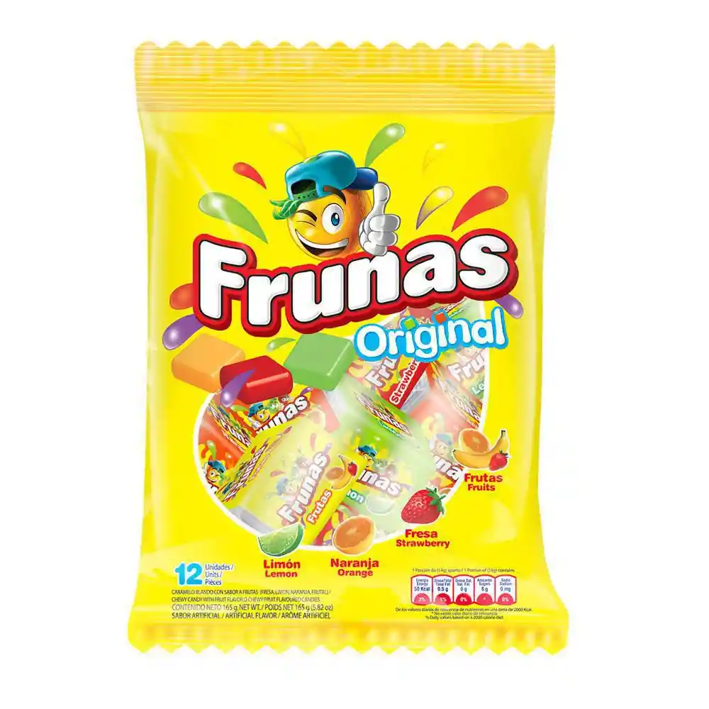 Caramelo blando masticable con sabor a frutas en forma de cubo. Sabores a limón naranja fresa y frutas. Bolsa con 12 unidades. Packing: Bolsa