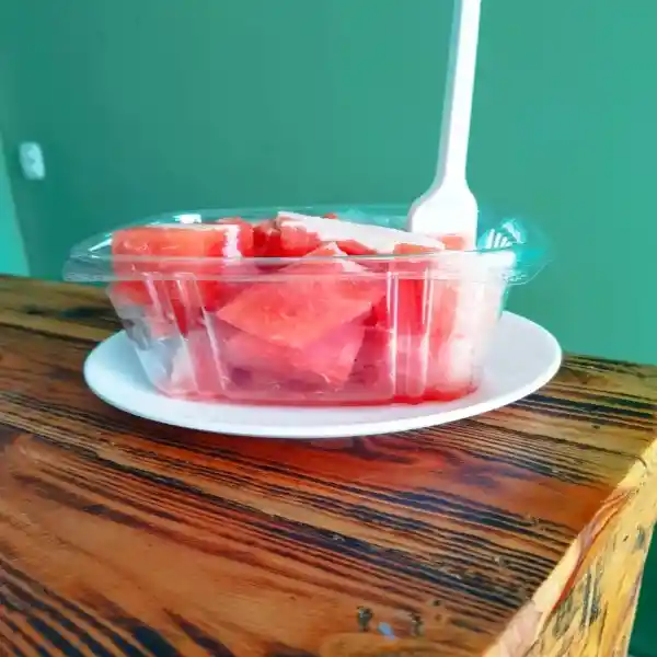Fruta picada. Con adicionales como limón, leche condensada.