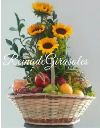Frutero con 4 Girasoles rosas, 2 Manzanas Verdes, 2 Manzanas Rojas, 2 Granadillas, 1 Piña, 1 Melón y Uvas