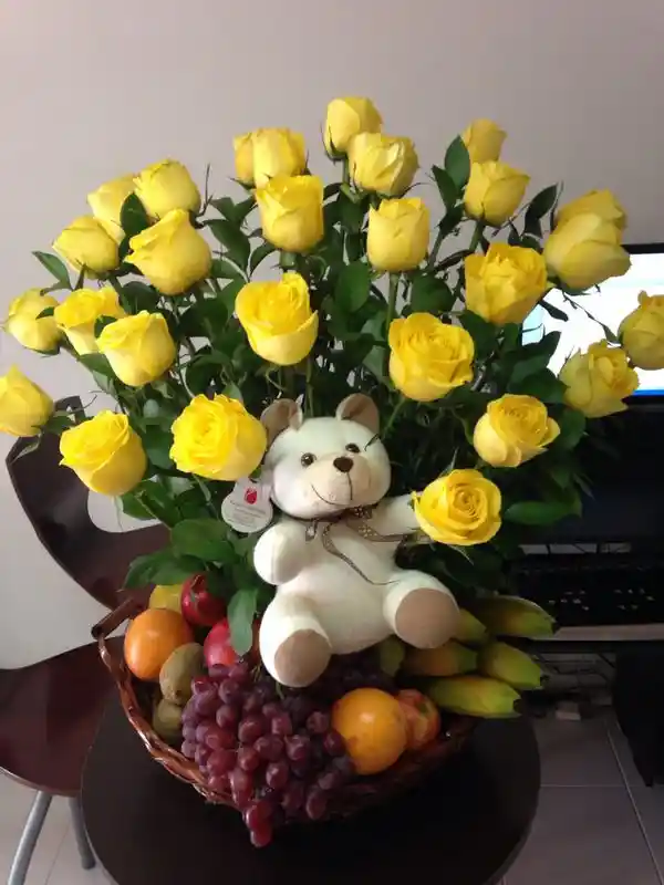 FRUTERO EN CANASTO FIQUE CON ARREGLO DE ROSAS Y FRUTA SELECIONADA.
