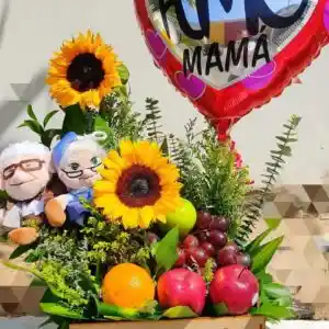 Frutero Con Girasoles , Soliaster , Eucalipto, Rusco Dracena , Manzana , Uvas , Pera , Mandarina Fresas , Caja Con Mensaje+ Pareja De Ancianos Up Y Globo Decorativo Que Varía Según Disponibilidad De Inventario Y Ocasión.