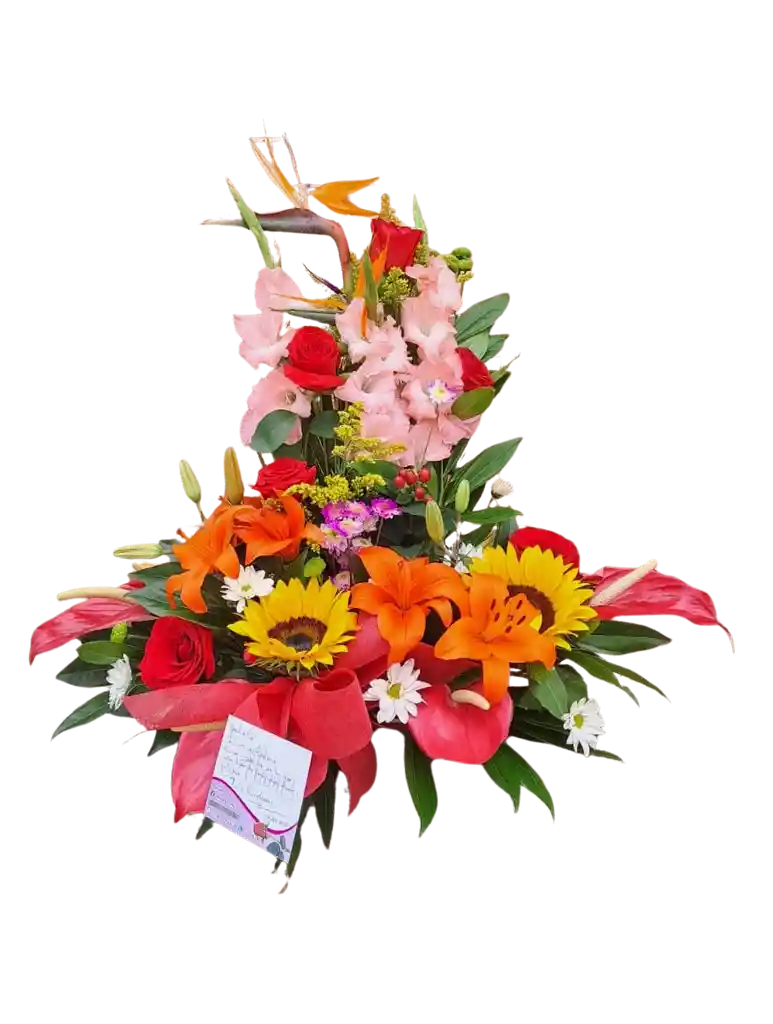 Ave del paraíso, rosas, girasoles, lirios naranjas y gladiolos en un solo arreglo exuberante. Todo el color y la generosidad de Colombia reunidos para celebrar a quien más quieres (incluye tarjeta personalizada)