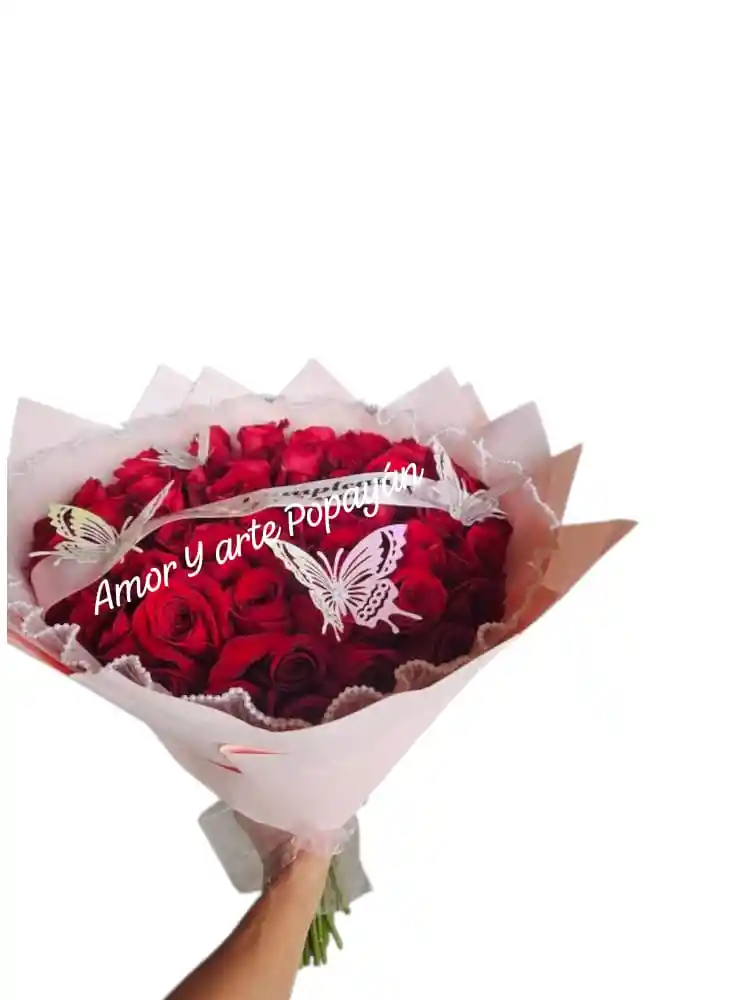 Ramo buchón de rosas y mariposas con listón. Incluye: moño, tarjeta con mensaje personalizado, aroma, brillo.