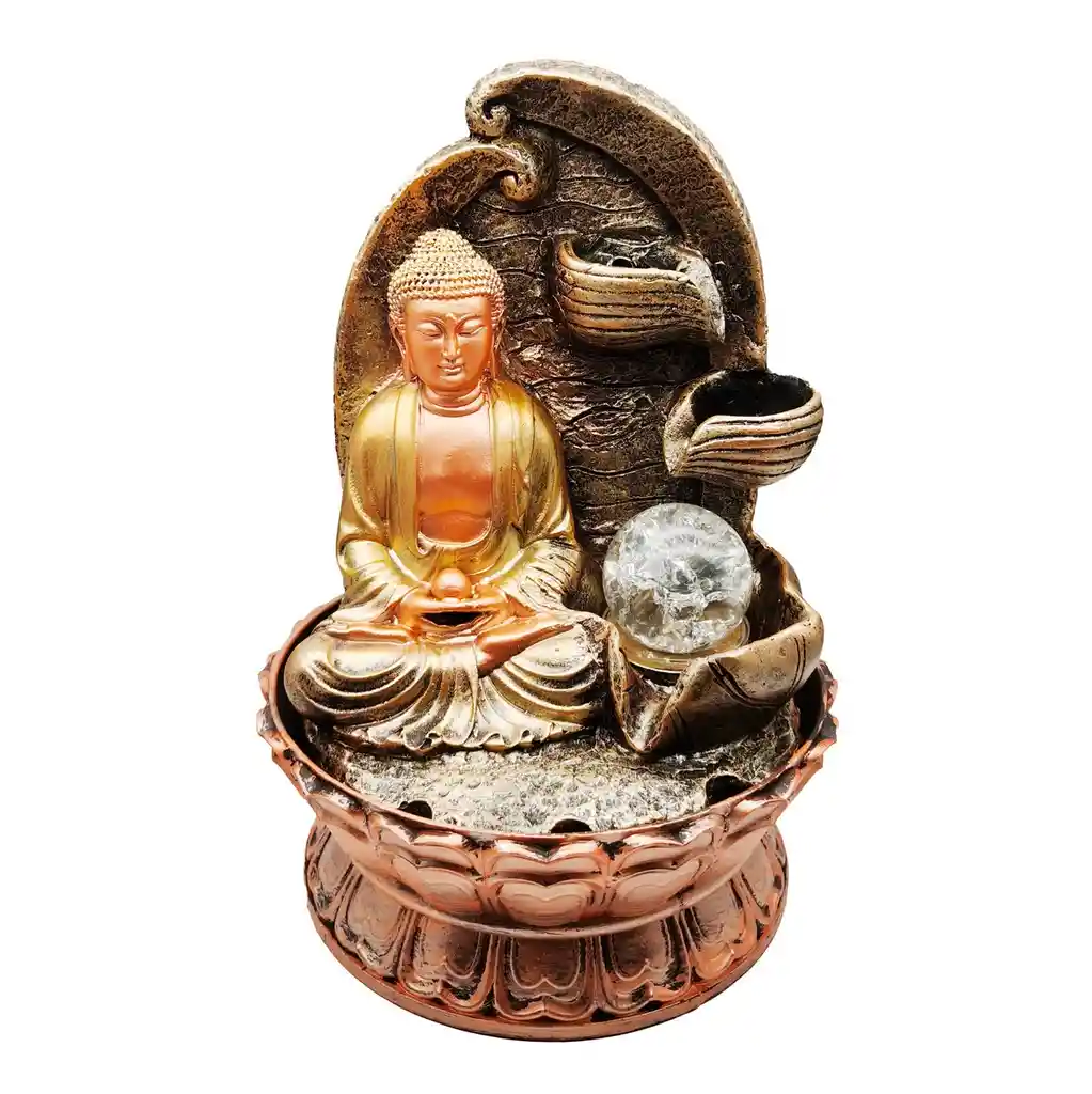 La fuente de agua con figura indu es una pieza de arte y funcionalidad. Con su bomba de agua silenciosa y regulación de velocidad, crea un ambiente relajante. La esfera de cristal esmerilada ilumina la figura indu tallada, añadiendo un toque mágico. Ideal para cualquier espacio que busque elegancia y serenidad. Acompañado de la figura de Buda sentada o meditando, esta postura significaría un tipo de conciencia mayor. En este estado del ser, el materialismo ya no importa. Ficha Técnica: Dimensiones: 29 cm x 20 cm x 20 cm Material: Poliresina Fuente : Enchufe a Corriente eléctrica Lugares Adecuados: Casa, Local , Oficina u otros ** _Para defectos de fábrica o retractos: \_Por favor revise el producto apenas lo reciba y antes de usarlo. No aplican ley de retracto o defectos de fábrica luego de usar el producto. Se manejan máximo 5 días para reportar defectos de fábrica (por ejemplo, producto funciona mal, piezas faltantes, rotas, etc). Para hacer efectiva la devolución el producto debe devolverse con el empaque original, el cual debe estar en buen estado, incluir todos los documentos y las partes completas y sin daños.