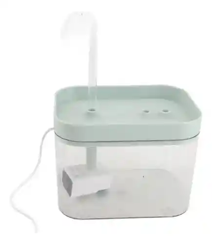 fuente de agua para mascotas, comúnmente utilizada para gatos o perros pequeños. Descripción del producto: Diseño: Presenta un diseño moderno y minimalista con un depósito de agua transparente que permite ver el nivel del líquido y una base superior de color verde menta o azul claro. Funcionalidad: Incorpora un sistema de circulación de agua con una bomba sumergible visible en la parte inferior del depósito, que impulsa el agua hacia una boquilla superior, creando un flujo continuo o tipo cascada. Material: Generalmente fabricada con plásticos aptos para uso alimentario, seguros para las mascotas.