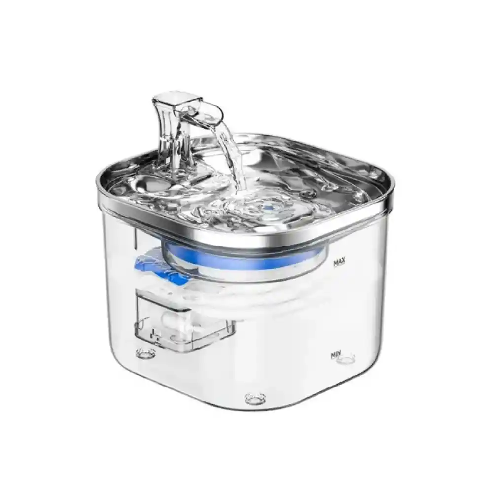 Convierte la hidratación diaria de tu peludito en una experiencia más saludable, divertida y segura. Esta Fuente de Agua Transparente y Acero Inoxidable 2 Litros, combina acero inoxidable y plástico libre de BPA para ofrecer una solución higiénica y duradera que estimula el consumo de agua tanto en gatos como en perros pequeños. Su sistema de recirculación silencioso mantiene el agua fresca, oxigenada y libre de impurezas con su esquema de triple filtración, promoviendo la salud renal y urinaria de tu compañero peludo. La bandeja de almacenamiento de agua de acero inoxidable puede proporcionar 120 ml de agua de emergencia para mascotas en caso de corte de energía. ¿De qué materiales está hecha esta Fuente de Agua Transparente y Acero Inoxidable 2 Litros? ¿Es segura? Sí. La parte superior es de acero inoxidable, lo que reduce la acumulación de bacterias y es fácil de limpiar. El resto está fabricado con plástico libre de BPA, completamente seguro para tu peludo. ¿Es ruidosa? No. Cuenta con una bomba de agua ultra silenciosa, ideal para espacios tranquilos o peludos sensibles al ruido. No afectará su sueño ni el de tu peludo. ¿Qué capacidad tiene? Cuenta con una capacidad de 2 litros, perfecta para gatos y perros pequeños o medianos. Además la bandeja de almacenamiento de agua de acero inoxidable puede proporcionar 120 ml de agua de emergencia para mascotas en caso de corte de energía. ¿La Fuente de Agua Transparente y Acero Inoxidable 2 Litros Incluye filtro? Sí. Viene con 3 filtros reemplazables que ayuda a eliminar impurezas, pelos y malos olores, proporcionando agua fresca y saludable para tu peludo. ¿Cada cuánto se debe cambiar el agua? Se recomienda rellenarla diariamente y hacer una limpieza completa cada 5 a 7 días para mantener el sistema limpio y eficiente.¡ ¿Que contiene la caja? 1 – fuente de agua para gatos. 1 – cable USB 1 – Adaptador de corriente incluido. 1 – Sistema de filtro 1 – Manual de usuario ¿Por qué es importante usar una fuente de agua para gatos o perros? Muchos peludos no beben suficiente agua. Al moverse y oxigenarse, el agua resulta más atractiva, lo que estimula su consumo y favorece el buen funcionamiento de los riñones y del sistema urinario.