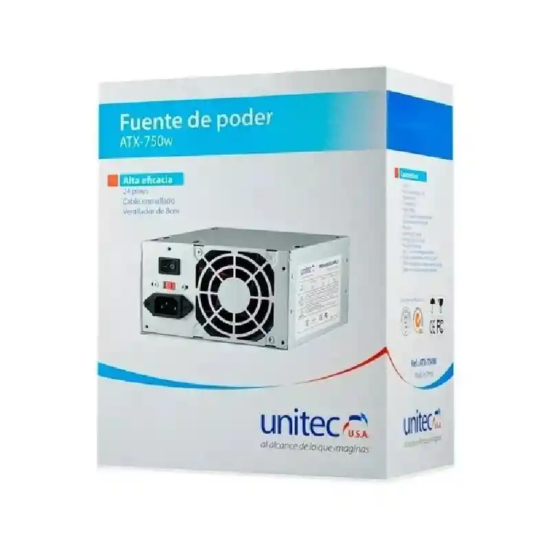 Fuente de poder UNITEC 750W para el funcionamiento de cualquier ordenador. La fuente ideal para el computador ideal 750W de pura potencia (vatiaje no real). Fuente de poder ATX-750w Unitec esta elaborada en un material de metal además de contar con 24 pines, cable de poder de 1.5 metros, ventilador de 8 cm Con 2 conectores sata, cable enmallado y 2 anillos magnéticos de cobre para su mejor funcionamiento.