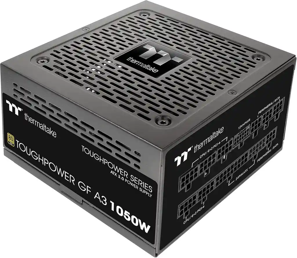 GARANTIA DE FABRICA 10AÑOS Nombre del modelo: GF A3 1050 Marca: themaltake-Toma térmica Dispositivos compatibles: Computadora Personal Tipo de conector: ATX, PCI Express Potencia de salida: 1050 Factor de forma: ATX Potencia: 1050 vatios Método de refrigeración: Aire Dimensiones del artículo: LxWxH 5,9 x 3,4 x 5,5 pulgadas Peso del artículo: 3,59 libras • Certificado 80 Plus Gold totalmente compatible con los estándares Intel ATX 3.0 • Listo para PCIe Gen 5.0 •Hecho para cumplir con las últimas tarjetas gráficas •Tecnologías de alta clase de riel de +12V de alto amperaje •Cables planos completamente modulares de bajo perfil