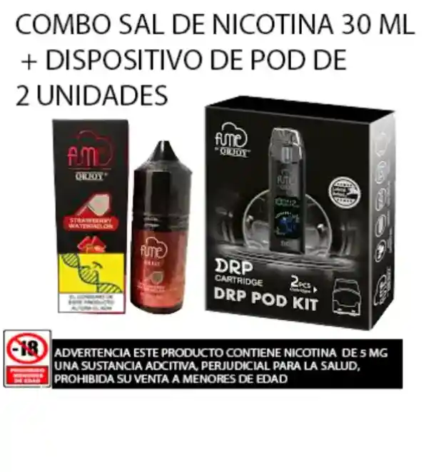 Fume DRP Pod Kit con 2 cartuchos y 30ML de sal de nicotina. Diseñado para quienes saben lo que quieren.” Advertencia ⚠ este producto contiene nicotina una sustancia adictiva, es perjudicial para la salud, prohibida su venta a menores de edad, antes de usar leer indicaciones y contraindicaciones del producto