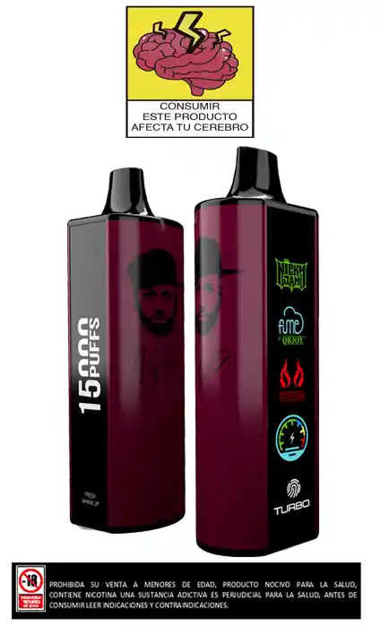VAPEADOR FUME NICKY JAM 15.000 PUFFS 5% NIVEL DE NICOTINA SABOR FRESA SANDIA PANTALLA TACTIL INDICADORA NIVEL DE BATERIA. Este producto contiene nicotina una sustancia adictiva, es perjudicial para la salud, prohibida su venta a menores de edad, antes de consumir leer indicaciones y contraindicaciones