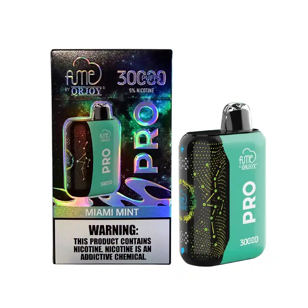MIAMI MINT. Conoce el desechable más potente de Fume. Con 30,000 caladas, tecnología Dual Mesh Coil y una brillante pantalla, el FUME PRO ofrece sabor inigualable, caladas suaves y control total en un diseño recargable y elegante.