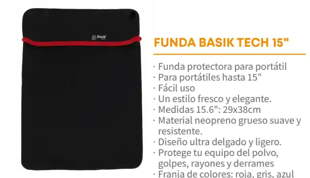 Funda protectora para portátil · Para portátiles hasta 15" · Fácil uso · Un estilo fresco y elegante. · Medidas 15.6": 29x38cm · Material neopreno grueso suave y resistente. · Diseño ultra delgado y ligero. · Protege tu equipo del polvo, golpes, rayones y derrames