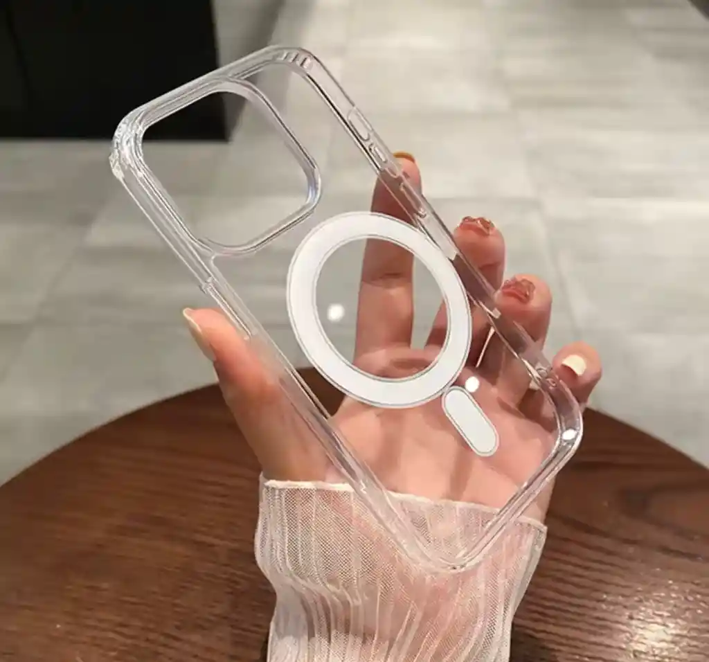 Funda de carga inalámbrica transparente magnética compatible con iPhone 15. Diseñada para proteger tu dispositivo sin ocultar su estilo original, cuenta con un acabado cristalino resistente a rayones y al amarillamiento. Su anillo magnético integrado permite una alineación perfecta con cargadores inalámbricos tipo MagSafe, garantizando una carga rápida, segura y sin interrupciones. Los bordes reforzados ofrecen mayor protección contra caídas y golpes, mientras que sus recortes precisos aseguran acceso cómodo a botones, cámara y puertos. Ligera, resistente y elegante, esta funda es ideal para quienes buscan protección y funcionalidad en un solo producto.