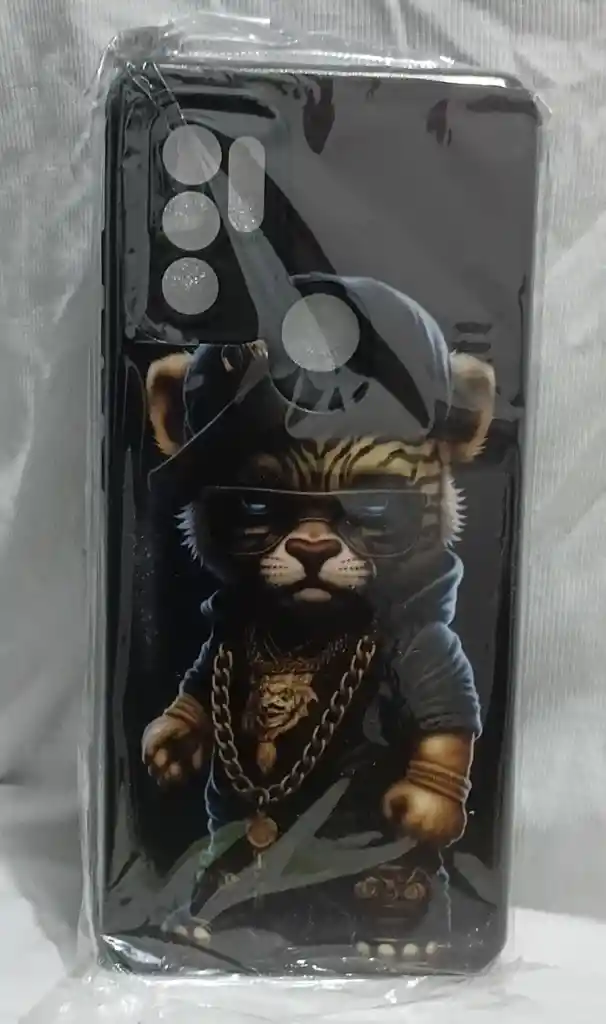 Dale una personalidad ruda y moderna a tu teléfono con este protector de estilo urbano. Compatibilidad: Ajuste perfecto para el modelo Moto G60S. Estilo Impactante: Gráfico detallado de un cachorro de tigre con look de rapero, incluyendo gorra, gafas de sol y cadenas doradas sobre un fondo negro elegante. Acabado de Calidad: Impresión de alta definición que no se desgasta fácilmente con el uso diario. Funcionalidad: Mantiene el perfil delgado de tu teléfono mientras protege la parte trasera y los bordes. Fácil Acceso: Diseño pensado para no obstruir el lector de huellas trasero ni las cámaras.