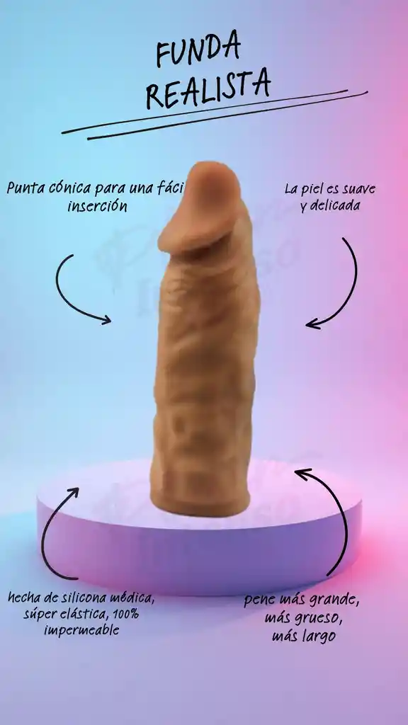 La piel es suave y delicada, hecha de silicona médica, súper elástica, 100% impermeable, fácil de limpiar, sensación natural de la piel, forma realista. Usarlo puede hacer que su pene sea más grande, más grueso, más largo y prolongar el tiempo de eyaculación. Aumenta el placer de las mujeres. CARACTERÍSTICAS: LARGO 15 CM DIAMETRO 5CM