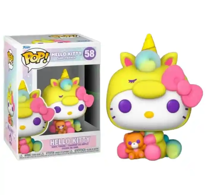 Funciones y detalles ¡Estás invitado a la fiesta de pijamas de tus sueños! Pop! Hello Kitty Unicorn Party lleva coloridos pijamas de unicornio mientras sostienes un oso de peluche. Colecciónala para una adición mágicamente dulce a tu juego Sanrio. La figura de vinilo mide aproximadamente 3.9 pulgadas de alto.