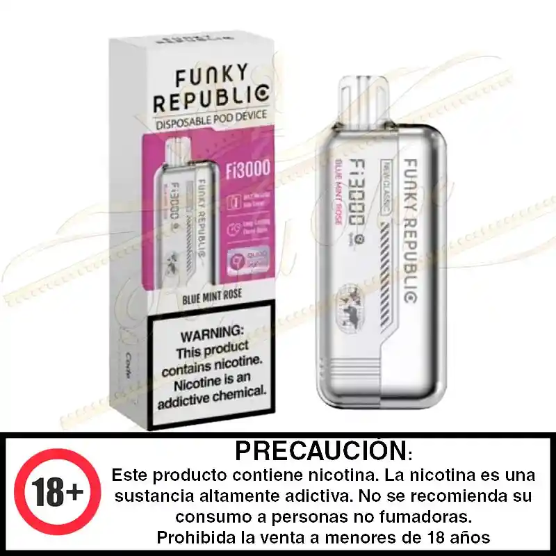 Dispositivo de vapeo desechable 3,000 caladas aproximadas Concentración de nicotina: 5% - 50mg por ml Sabor: Frambuesa azul, rosas y menta Ingredientes: Glicerina vegetal, Propilenglicol, nicotina, Acido Benzoico y saborizantes artificiales El número de caladas puede variar de acuerdo a los hábitos de vapeo del usuario, entre más largas y profundas las inhalaciones menos cantidad de Caladas dura Material: PCTG Batería: 800 Mah no recargable Contenido liquido: 5ml Incluye: 1 dispositivo desechable ADVERTENCIA Este producto contiene nicotina, una sustancia muy adictiva. No debe ser usado por mujeres embarazadas o personas con problemas respiratorios, no se recomienda su uso a no fumadores, mantener fuera del alcance de niños y mascotas, en caso de accidente consulte a su médico. Recuerda si no fumas no vepees, ESTE PRODUCTO PUEDE SER PELIGROSO Y PERJUDICIAL PARA LA SALUD. Vapear no es un juego ni una moda. Prohibida su venta a menores de edad.