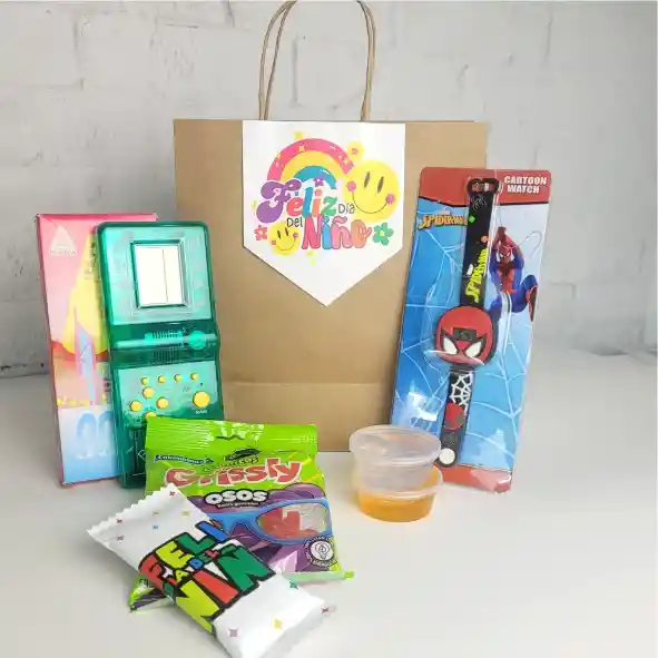 BOLSA KRAFT IDEAL PARA TODA OCASIÓN QUE CONTIENE: 1 ATARI 99 JUEGOS (COLORES SURTIDOS) - 1 RELOJ DE PERSONAJES ( PERSONAJES SURTIDOS) - 2 SLIME DE COLORES - 1 PAQUETE DE GOMAS - 1 CHOCOGALLETA - TARJETA